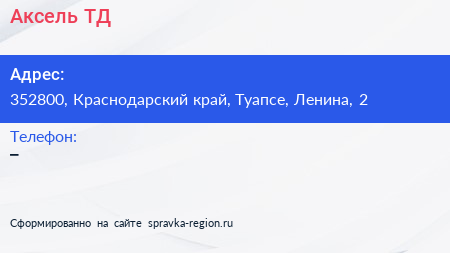 Аксель ТД по адресу 352800, Краснодарский край, Туапсе, Ленина, 2 в дальнейшем Организация, размещена в следующих категориях:
