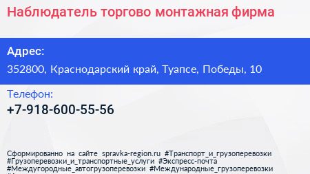 Наблюдатель, торгово-монтажная фирма по адресу 352800, Краснодарский край, Туапсе, Победы, 10 в дальнейшем Организация, размещена в следующих категориях: