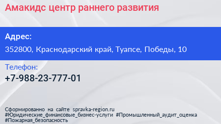 Амакидс, центр раннего развития по адресу 352800, Краснодарский край, Туапсе, Победы, 10 в дальнейшем Организация, размещена в следующих категориях: