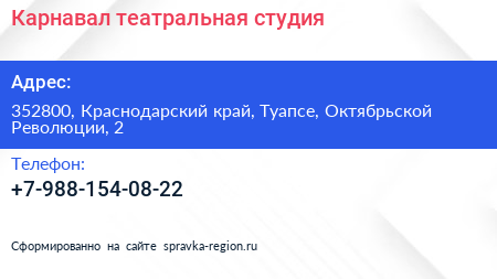 Карнавал, театральная студия по адресу 352800, Краснодарский край, Туапсе, Октябрьской Революции, 2 в дальнейшем Организация, размещена в следующих категориях: