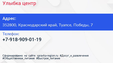 Улыбка, центр по адресу 352800, Краснодарский край, Туапсе, Победы, 7 в дальнейшем Организация, размещена в следующих категориях: