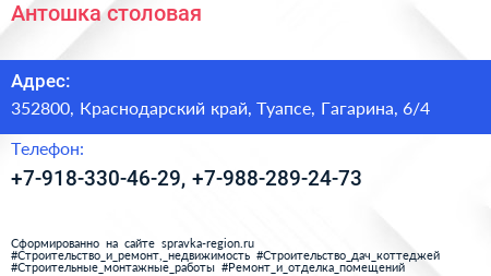 Антошка, столовая по адресу 352800, Краснодарский край, Туапсе, Гагарина, 6/4 в дальнейшем Организация, размещена в следующих категориях: