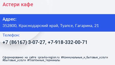Астери, кафе по адресу 352800, Краснодарский край, Туапсе, Гагарина, 21 в дальнейшем Организация, размещена в следующих категориях: