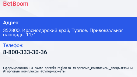 BetBoom по адресу 352800, Краснодарский край, Туапсе, Привокзальная площадь, 11/1 в дальнейшем Организация, размещена в следующих категориях: