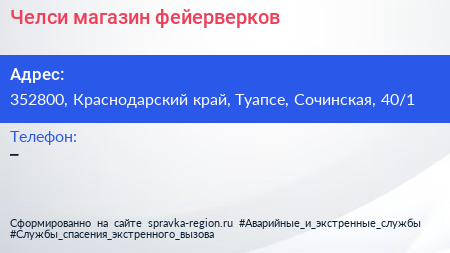 Челси, магазин фейерверков по адресу 352800, Краснодарский край, Туапсе, Сочинская, 40/1 в дальнейшем Организация, размещена в следующих категориях: