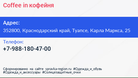 Coffee`in, кофейня по адресу 352800, Краснодарский край, Туапсе, Карла Маркса, 25 в дальнейшем Организация, размещена в следующих категориях: