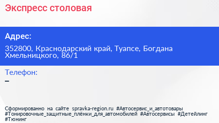 Экспресс, столовая по адресу 352800, Краснодарский край, Туапсе, Богдана Хмельницкого, 86/1 в дальнейшем Организация, размещена в следующих категориях: