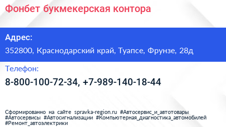 Фонбет, букмекерская контора по адресу 352800, Краснодарский край, Туапсе, Фрунзе, 28д в дальнейшем Организация, размещена в следующих категориях: