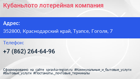 Кубаньлото, лотерейная компания по адресу 352800, Краснодарский край, Туапсе, Гоголя, 7 в дальнейшем Организация, размещена в следующих категориях:
