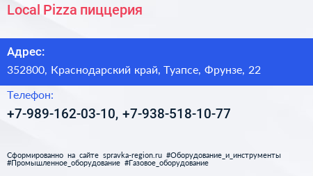 Local Pizza, пиццерия по адресу 352800, Краснодарский край, Туапсе, Фрунзе, 22 в дальнейшем Организация, размещена в следующих категориях: