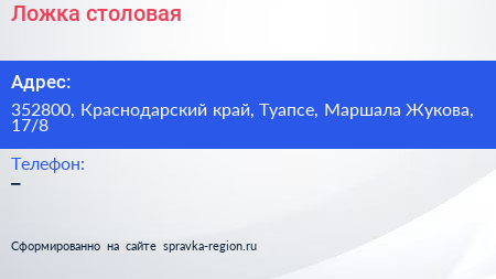 Ложка, столовая по адресу 352800, Краснодарский край, Туапсе, Маршала Жукова, 17/8 в дальнейшем Организация, размещена в следующих категориях: