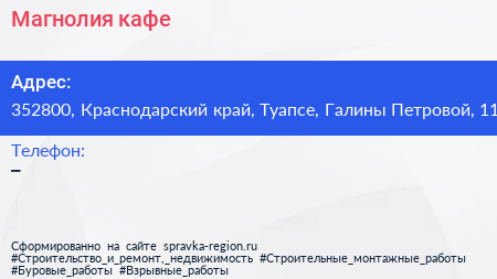 Магнолия, кафе по адресу 352800, Краснодарский край, Туапсе, Галины Петровой, 11 в дальнейшем Организация, размещена в следующих категориях: