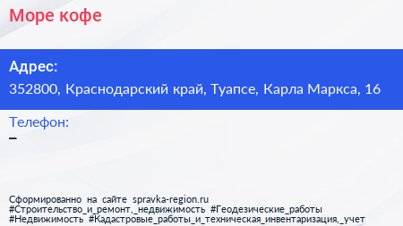 Море кофе по адресу 352800, Краснодарский край, Туапсе, Карла Маркса, 16 в дальнейшем Организация, размещена в следующих категориях: