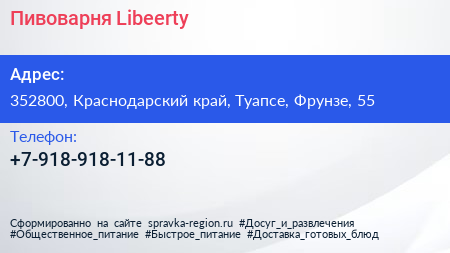 Пивоварня Libeerty по адресу 352800, Краснодарский край, Туапсе, Фрунзе, 55 в дальнейшем Организация, размещена в следующих категориях: