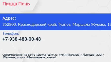 Пицца & Печь по адресу 352800, Краснодарский край, Туапсе, Маршала Жукова, 13 в дальнейшем Организация, размещена в следующих категориях: