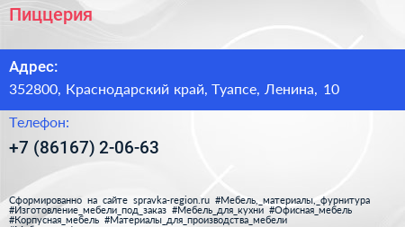 Пиццерия по адресу 352800, Краснодарский край, Туапсе, Ленина, 10 в дальнейшем Организация, размещена в следующих категориях: