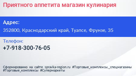 Приятного аппетита, магазин-кулинария по адресу 352800, Краснодарский край, Туапсе, Фрунзе, 35 в дальнейшем Организация, размещена в следующих категориях: