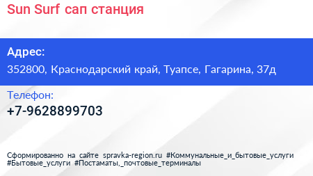 Sun Surf, сап-станция по адресу 352800, Краснодарский край, Туапсе, Гагарина, 37д в дальнейшем Организация, размещена в следующих категориях: