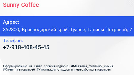 Sunny Coffee по адресу 352800, Краснодарский край, Туапсе, Галины Петровой, 7 в дальнейшем Организация, размещена в следующих категориях: