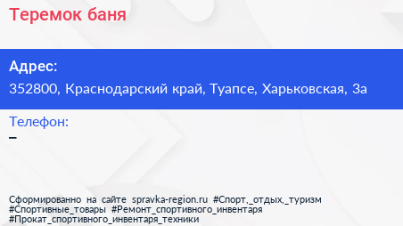 Теремок, баня по адресу 352800, Краснодарский край, Туапсе, Харьковская, 3а в дальнейшем Организация, размещена в следующих категориях: