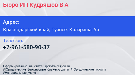 Бюро, ИП Кудряшов В.А. по адресу Краснодарский край, Туапсе, Калараша, 9а в дальнейшем Организация, размещена в следующих категориях: