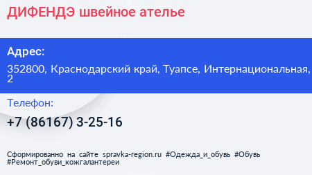 ДИФЕНДЭ, швейное ателье по адресу 352800, Краснодарский край, Туапсе, Интернациональная, 2 в дальнейшем Организация, размещена в следующих категориях: