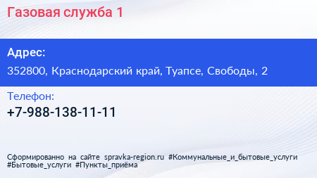 Газовая служба №1 по адресу 352800, Краснодарский край, Туапсе, Свободы, 2 в дальнейшем Организация, размещена в следующих категориях: