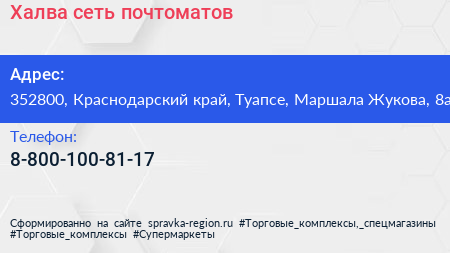 Халва, сеть почтоматов по адресу 352800, Краснодарский край, Туапсе, Маршала Жукова, 8а в дальнейшем Организация, размещена в следующих категориях: