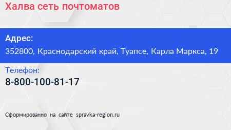 Халва, сеть почтоматов по адресу 352800, Краснодарский край, Туапсе, Карла Маркса, 19 в дальнейшем Организация, размещена в следующих категориях: