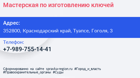 Мастерская по изготовлению ключей по адресу 352800, Краснодарский край, Туапсе, Гоголя, 3 в дальнейшем Организация, размещена в следующих категориях: