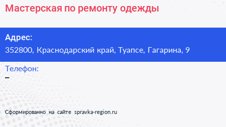 Мастерская по ремонту одежды по адресу 352800, Краснодарский край, Туапсе, Гагарина, 9 в дальнейшем Организация, размещена в следующих категориях: