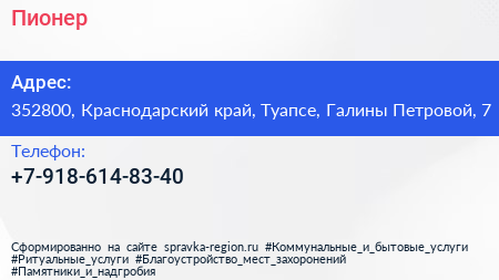Пионер по адресу 352800, Краснодарский край, Туапсе, Галины Петровой, 7 в дальнейшем Организация, размещена в следующих категориях: