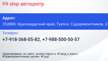 Pit-stop, автоцентр по адресу 352800, Краснодарский край, Туапсе, Судоремонтников, 2 в дальнейшем Организация, размещена в следующих категориях: