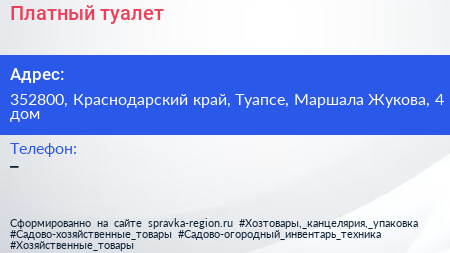 Платный туалет по адресу 352800, Краснодарский край, Туапсе, Маршала Жукова, 4 дом в дальнейшем Организация, размещена в следующих категориях: