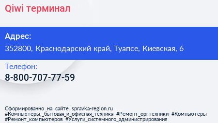 Qiwi, терминал по адресу 352800, Краснодарский край, Туапсе, Киевская, 6 в дальнейшем Организация, размещена в следующих категориях: