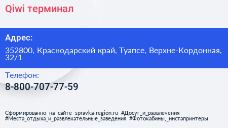 Qiwi, терминал по адресу 352800, Краснодарский край, Туапсе, Верхне-Кордонная, 32/1 в дальнейшем Организация, размещена в следующих категориях: