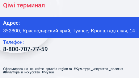 Qiwi, терминал по адресу 352800, Краснодарский край, Туапсе, Кронштадтская, 14 в дальнейшем Организация, размещена в следующих категориях:
