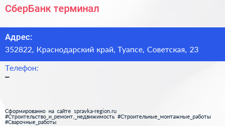 СберБанк, терминал по адресу 352822, Краснодарский край, Туапсе, Советская, 23 в дальнейшем Организация, размещена в следующих категориях: