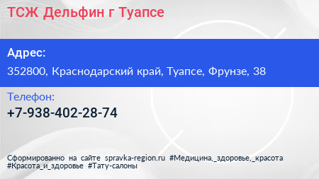 ТСЖ Дельфин, г. Туапсе по адресу 352800, Краснодарский край, Туапсе, Фрунзе, 38 в дальнейшем Организация, размещена в следующих категориях: