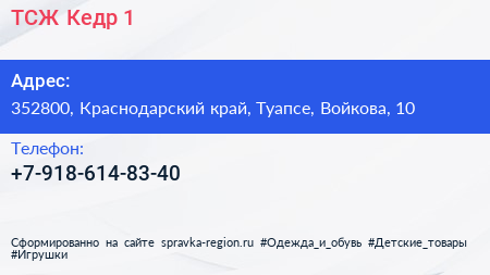 ТСЖ Кедр 1 по адресу 352800, Краснодарский край, Туапсе, Войкова, 10 в дальнейшем Организация, размещена в следующих категориях: