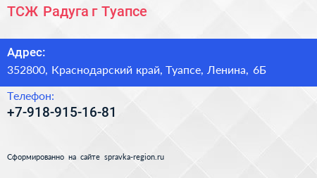ТСЖ Радуга, г. Туапсе по адресу 352800, Краснодарский край, Туапсе, Ленина, 6Б в дальнейшем Организация, размещена в следующих категориях: