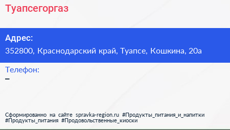 Туапсегоргаз по адресу 352800, Краснодарский край, Туапсе, Кошкина, 20а в дальнейшем Организация, размещена в следующих категориях: