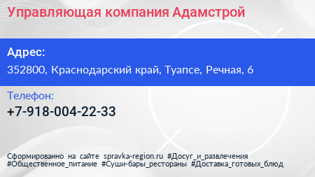 Управляющая компания Адамстрой по адресу 352800, Краснодарский край, Туапсе, Речная, 6 в дальнейшем Организация, размещена в следующих категориях: