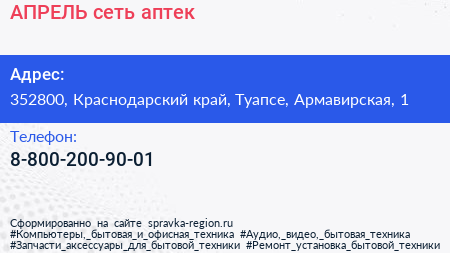 АПРЕЛЬ, сеть аптек по адресу 352800, Краснодарский край, Туапсе, Армавирская, 1 в дальнейшем Организация, размещена в следующих категориях: