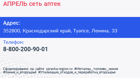 АПРЕЛЬ, сеть аптек по адресу 352800, Краснодарский край, Туапсе, Ленина, 33 в дальнейшем Организация, размещена в следующих категориях: