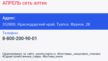 АПРЕЛЬ, сеть аптек по адресу 352800, Краснодарский край, Туапсе, Фрунзе, 28 в дальнейшем Организация, размещена в следующих категориях: