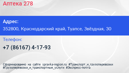 Аптека №278 по адресу 352800, Краснодарский край, Туапсе, Звёздная, 30 в дальнейшем Организация, размещена в следующих категориях: