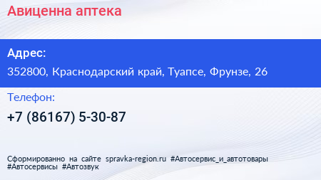 Авиценна, аптека по адресу 352800, Краснодарский край, Туапсе, Фрунзе, 26 в дальнейшем Организация, размещена в следующих категориях: