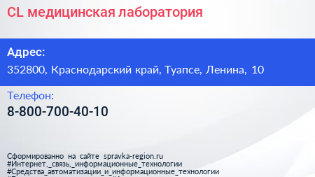 CL, медицинская лаборатория по адресу 352800, Краснодарский край, Туапсе, Ленина, 10 в дальнейшем Организация, размещена в следующих категориях: