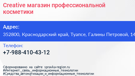 Creative, магазин профессиональной косметики по адресу 352800, Краснодарский край, Туапсе, Галины Петровой, 14 в дальнейшем Организация, размещена в следующих категориях: